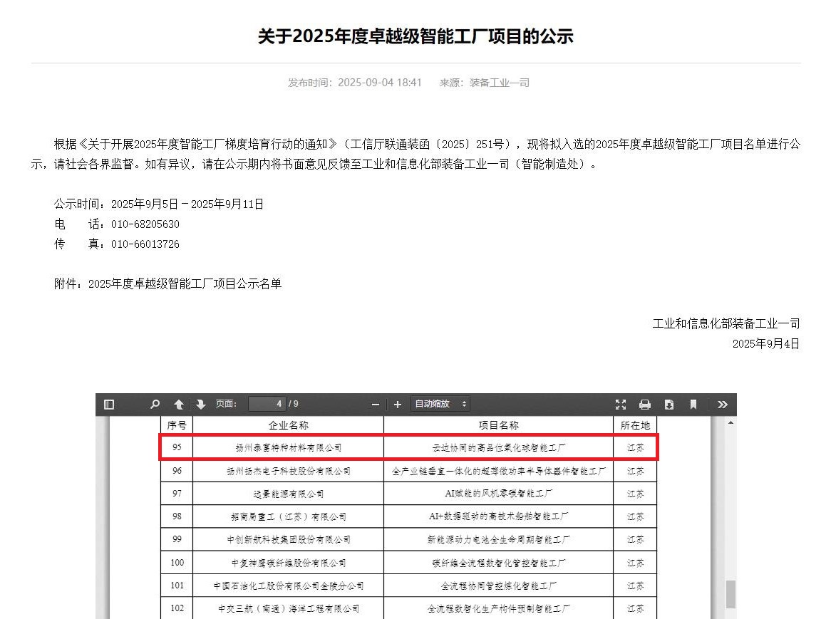 扬州特材先后荣获“国家级绿色工厂”“国家卓越级智能工厂”“智能制造国家级试点”“江苏省先进级工厂”“江苏省五星级上云企业”“江苏省健康促进企业”“江苏省工人先锋号”“扬州市市长质量奖”“扬州市工业百强企业”“扬州市纳税突出贡献企业”“扬州市职工劳动保护模范企业”等荣誉称号。
