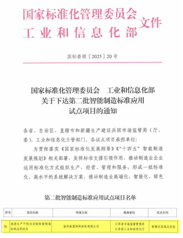 5月15日,扬州特材被评为江苏省先进级智能工厂。